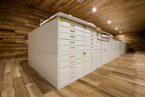 分1个周转库与3个藏品库,区域总面积1080平方米,拥有网架式、抽屉式、横梁式及其他类密集柜总计380节。藏品库采 用全木板内饰,配置恒温恒湿系统、气体消防安控系统、震动监控系统、水浸监控系统、红外监控系统与视频监控系统,全方位保护藏品安全。